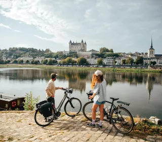 Blick auf eine Anlage von seltener Eleganz, deren weiβer Tuffstein mit dem Blau des Schiefers verziert ist, was sich im Wasser des Flusses wiederspiegelt... Hier, in Montsoreau, an der Grenze zum Departement Indre-et-Loire, beginnt (oder endet, je nachdem!) die Strecke der Loire à vélo in unserer Region. 230 km angelegte Radwege, die zu den 800 km zwischen Cuffy im Departement Cher und Saint-Brevin-les-Pins in der Loire-Atlantique gehören.