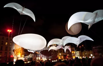 Diese poetische Kreation der Kompanien Aérosculpture und Quidam, mit dem Akkordeonisten Nano, riss das Publikum dank der groβen weiβen Vögel, die über dem Fluss Maine flogen, aus der Wirklichkeit. In den Lüften tobten sie sich aus und vollbrachten ein majestätisches Ballett, das von der bezaubernden Musik eines Orchesters begleitet wurde.
