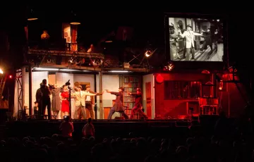 Dieses von der rührigen lokalen Gruppe Jo Bithume erfundene Schauspiel besaβ eine eindrucksvolle Szenografie. Es erzählte die Geschichte einer Gemeinschaft von Männern und Frauen, die auszogen, um auf einer Offshore-Plattform die Stadt ihrer Träume zu bauen, um dem ökonomischen und ökologischen Chaos zu entkommen.