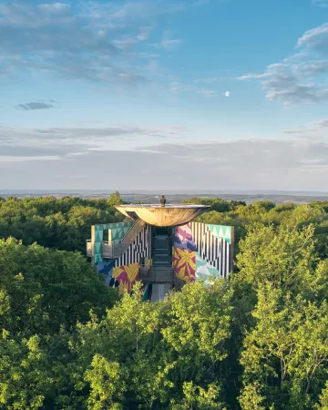 Es ist an der Zeit, die 108 Stufen des Aussichtsturms auf dem Mont des Avaloirs zu erklimmen. Das mit einem Street-Art-Wandgemälde geschmückte Gebäude führt Sie auf den höchsten Punkt des Grand Ouest (417 m). Vom Gipfel aus bietet sich Ihnen ein 360°-Panorama, das bis zu 100 km in die Ferne reicht. Unterhalb des Berges befinden sich Schautafeln, die die Geschichte dieses geheimnisvollen Ortes erläutern.