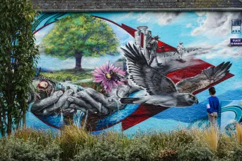 Erreichen Sie Pré-en-Pail-Saint-Samson für einen farbenfrohen Spaziergang durch seine Gassen. Hier sind die Fassaden nicht einfach nur Mauern, sondern Leinwände, auf denen sich die Künstler ausdrücken. Blicken Sie nach oben, um die vibrierenden Fresken zu bewundern, die das Städtchen in eine Freiluftgalerie verwandeln: hier das Werk der kolumbianischen Künstler Pac Dunga und Arté Vital; dort die Pinsel von Bertrand Godard, einem Maler aus der Normandie; weiter hinten ein lächelnder Fernandel, der unter dem Strich von Lionel Rocton eine Pizza genießt.